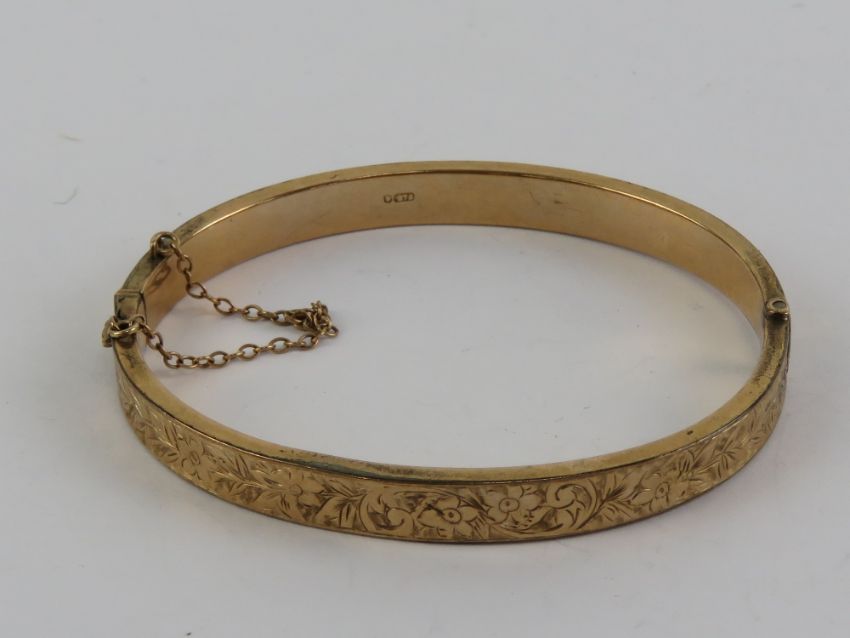 A vintage 9ct gold hinged bangle having floral engraving to front, Chester hallmark, 5 x 6cm internal dia, 7.8g.