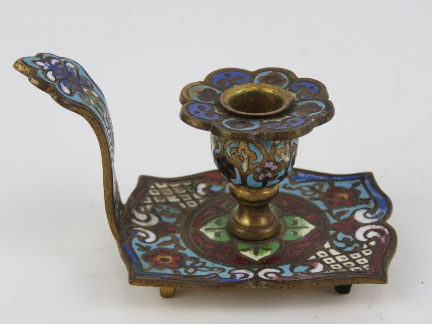 A miniature early 20th century cloisonné chamber stick, 4cm high, together with a pair of floral cloisonné frogs each measuring 4cm in length.