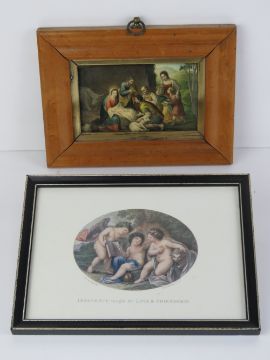 Coloured print on celluloid, biblical stable birth scene, in moulded maple frame, all measuring 17 x 22cm. Together with a coloured print 'Innocence taught by love and friendship' by Bartolozzi.