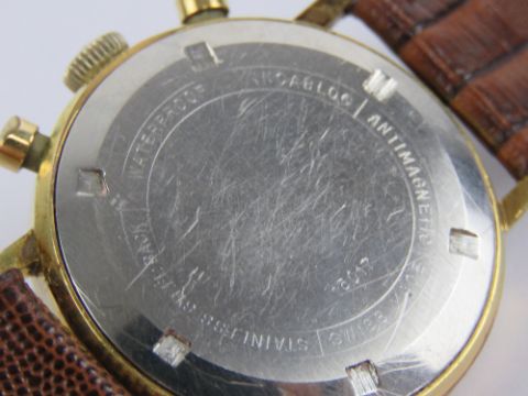 An Avia chronograph wristwatch having white dial with two subsidiary dials and leather strap.