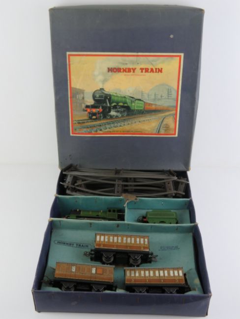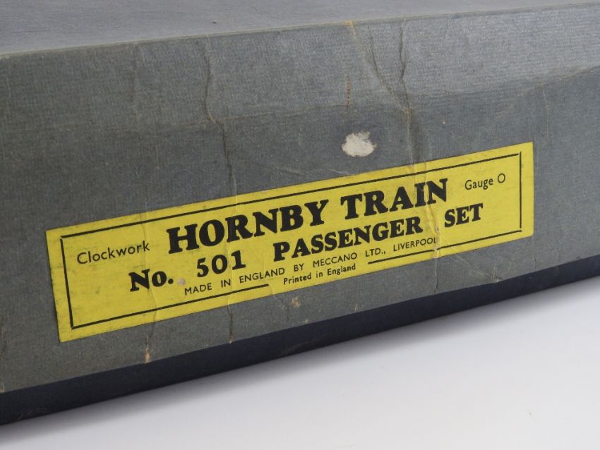 A Hornby train passenger set 0 gauge number 501, comprising clockwork locomotive tender three carriages and track, within original box.