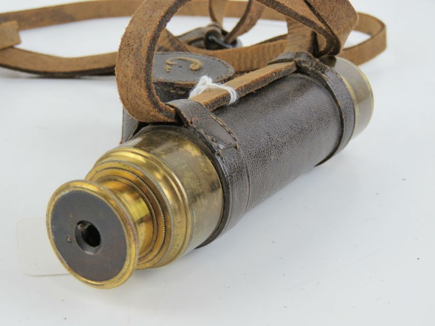A brass and leather clad three drawer monocular having end caps and strap, 40.5cm extended.