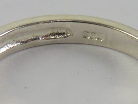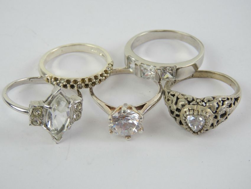 Two silver and single white stone rings, size L-M, together with a silver white stone ring a/f, a ring with trio of square cut white stones, and a costume jewellery ring. Five items.