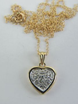 A 9ct gold pendant having central white metal heart set with diamonds, yellow metal surround, all stamped 375, on a fine 9ct gold chain, total weight 1g.