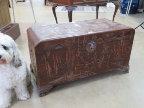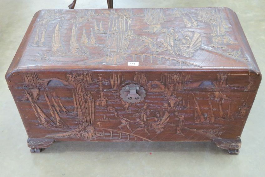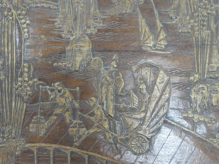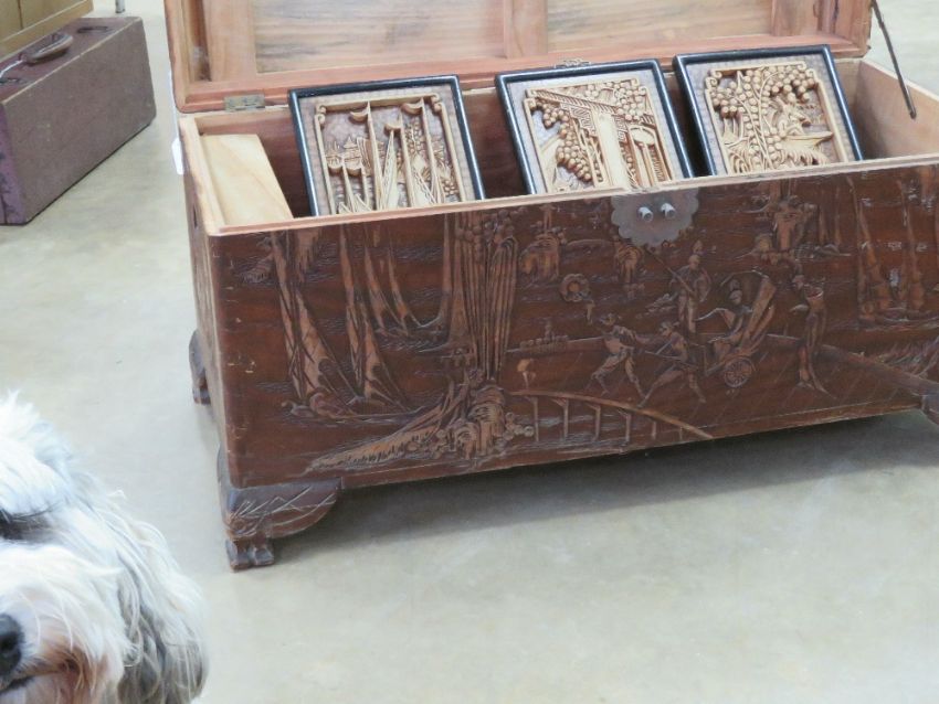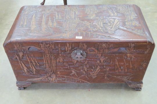 An early 20th century Oriental part carved camphor wood lidded trunk, depicting rural waterside scene to the lid and sides, measuring 94cm wide. Lid opening to reveal 'candle box' within, and a set of three mid 20th century Oriental relief panels.