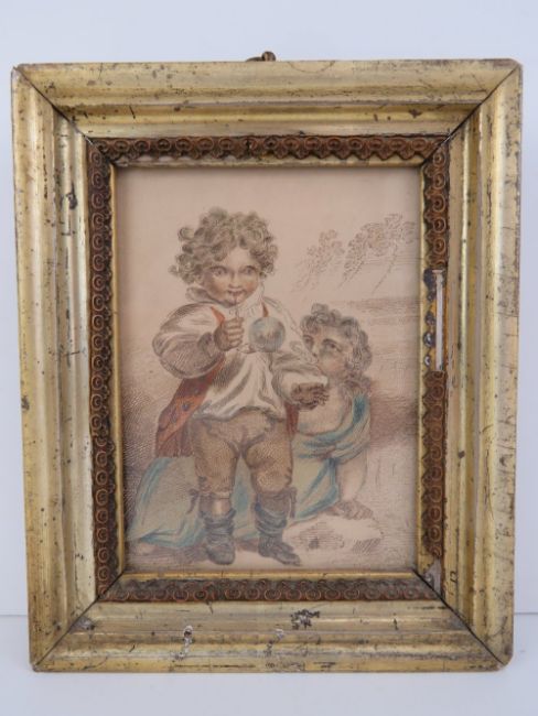 Print; early Georgian cartoon depicting young children blowing bubbles, trees beyond, hand tinted, 14.5 x 10.5cm, within simple gilded frame.