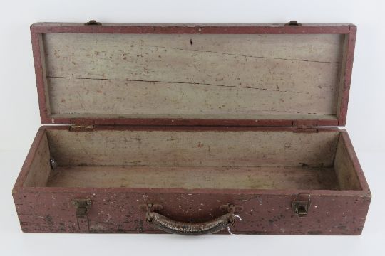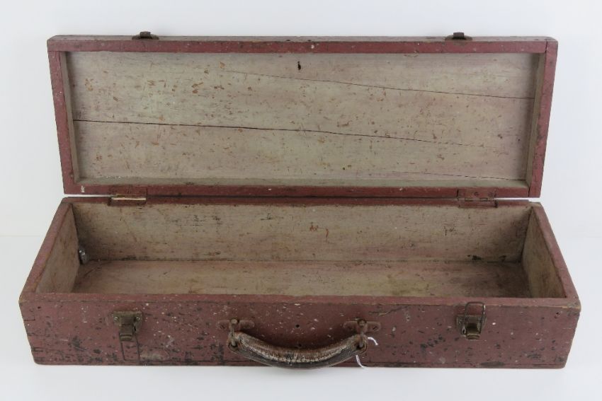 A vintage wooden tool box with leather handle, measuring 66 x 22 x 15cm.