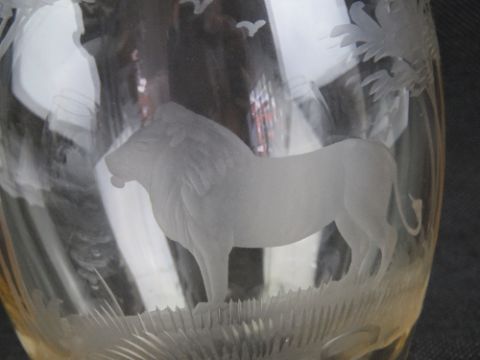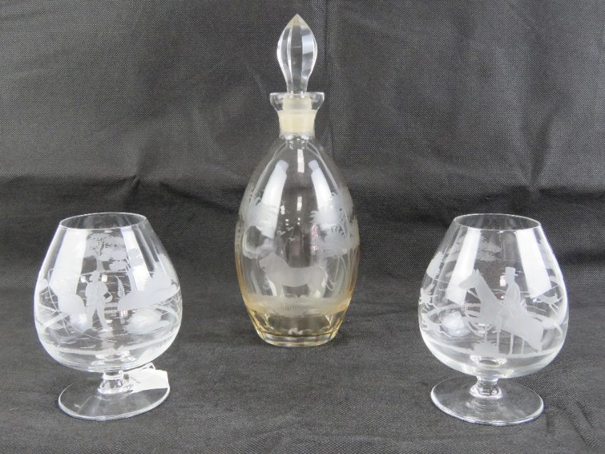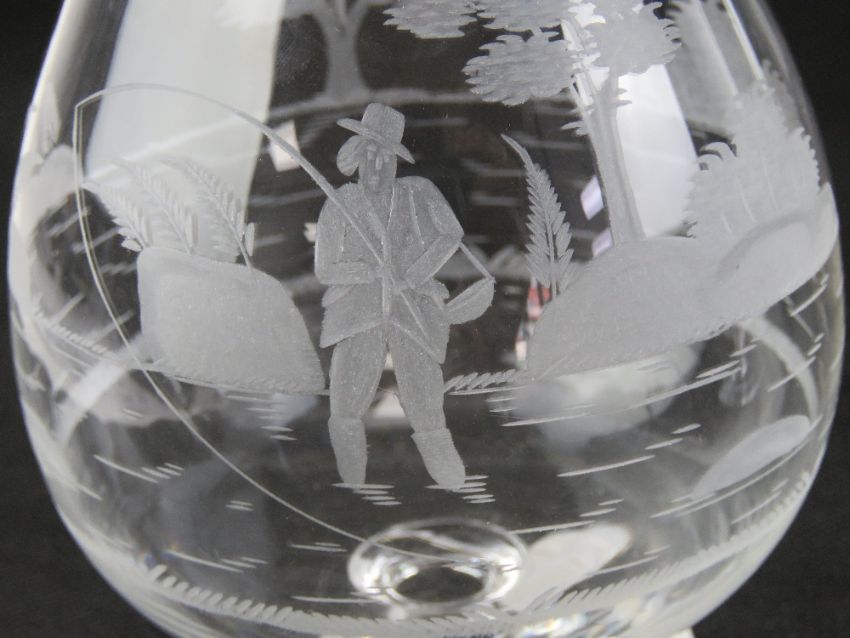 A large pair of etched glass brandy balloons, one having a fishing theme and one with hunting theme. Together with a similar etched decanter having Lion in savanna setting, standing 30cm high. Three items.