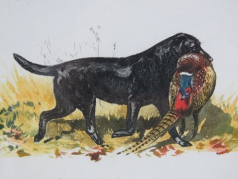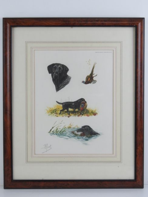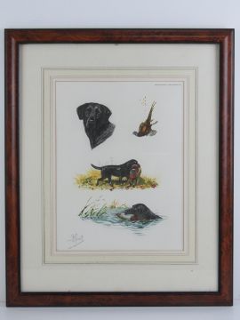 After Boris Stfanovitch Riabouchinsky (1898-1975) French, coloured sporting etching, marked to top 'Ch.Ducher et Cie . 35 Ave de l' Opera , Paris No 737', black Labrador studies. Posthumously signed in pencil lower left 'B Riab'. 13 1/4 x 10" (30.6 x 25.4cm). In a figured walnut and ebonised frame.