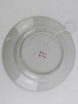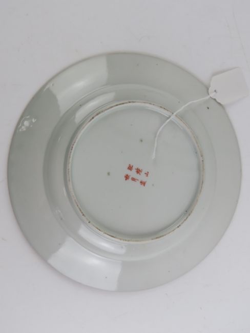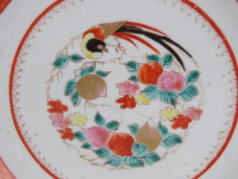 An Oriental pottery figurine of a Turkey having gilt wings, together with an Oriental porcelain dish having orange decoration upon featuring figural scenes, bird and foliage, 25cm dia, having character marks to base. Two items.