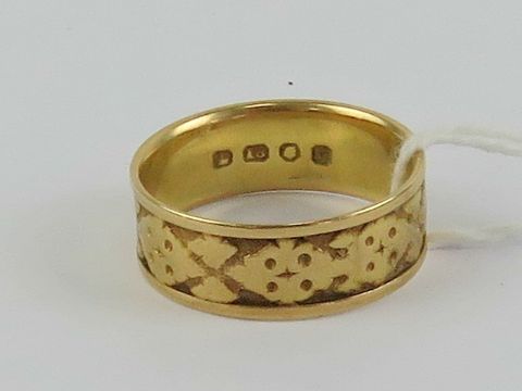 An 18ct gold wide band having Celtic style pattern upon, London hallmark, size Q, 5g.