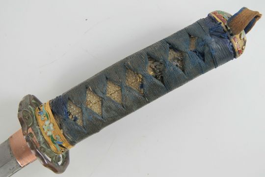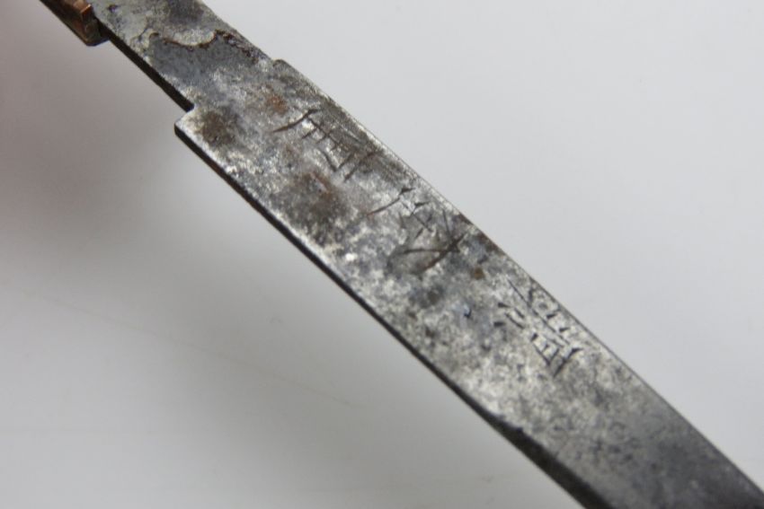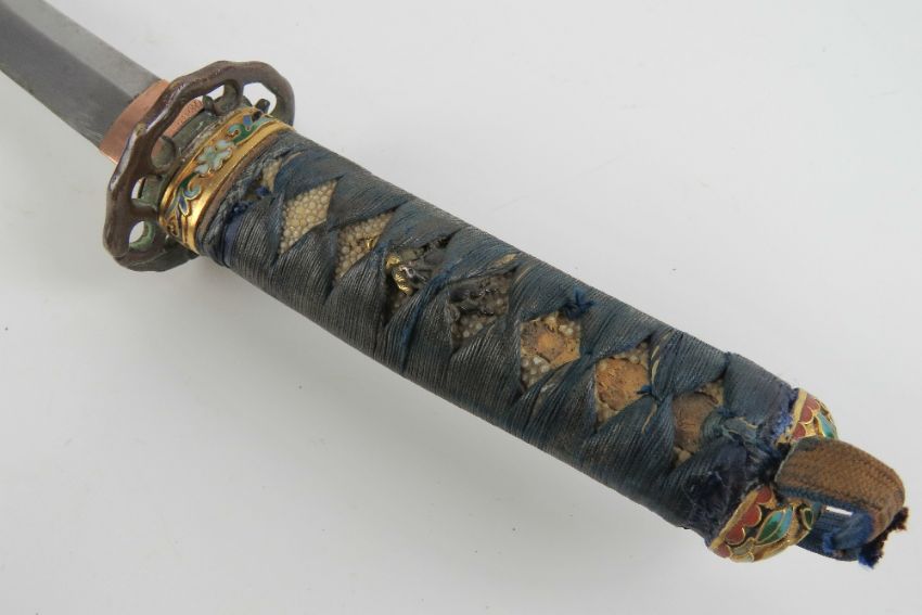 Tanto 18th century Mumei unsigned knife set with blade inside sheath, good condition and original old polish, blade is typical Bizen/Bungo work, Crabs claws in Hamon. Approx. 14.5 inch cutting edge.
