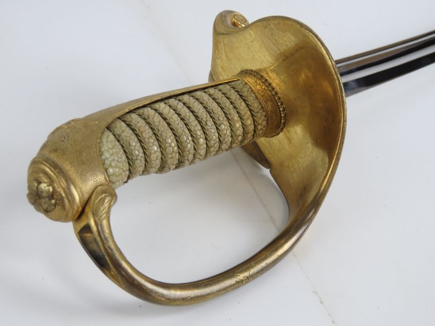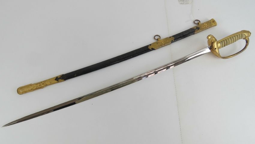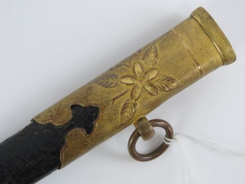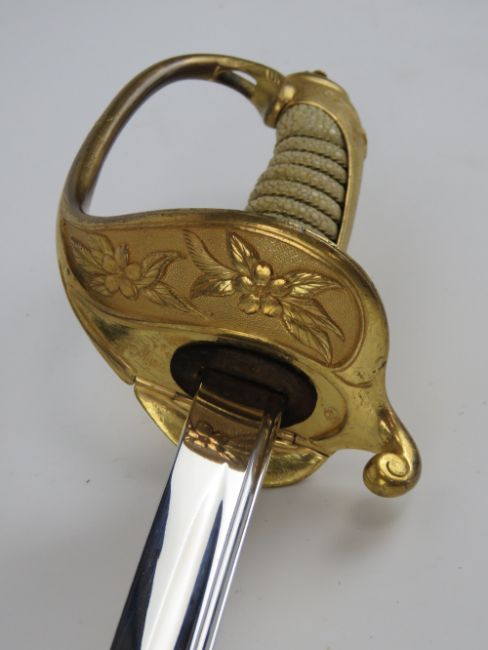 An Imperial Japanese Navy sword Circa 1900 in very good condition, Approx. 26" cutting edge, Mark of the Suya sword company (Private) on guard the has a II leaf variant ensign through to captain rank.