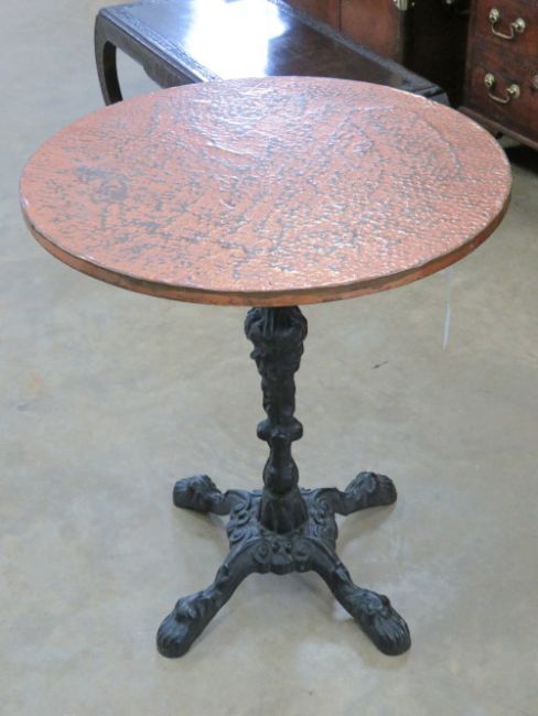 A circular beaten copper pub style table having cast iron quatreform base.