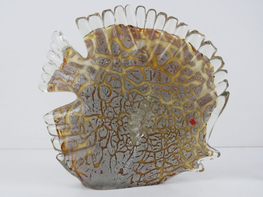 A Murano style glass fish in yellows and silver, 16.5cm high, together with two miniature glass animals. Three items.