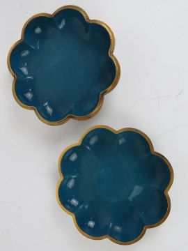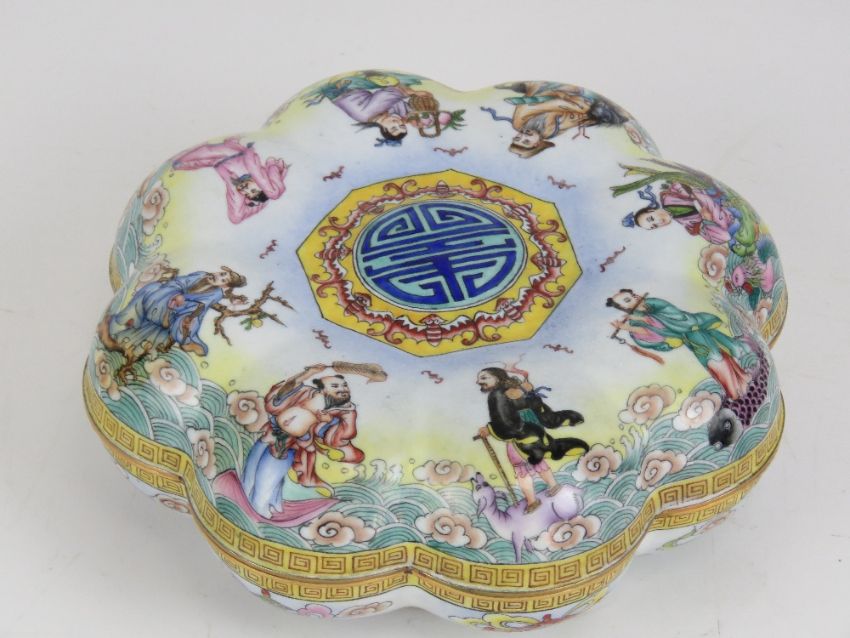 A Chinese Canton enamel on brass dressing table box having figures upon a sea, 16cm dia.