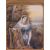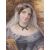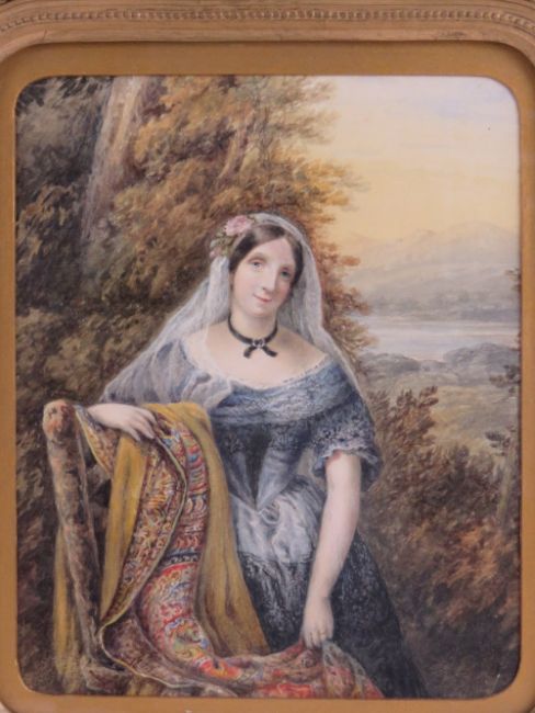 A delightful Welsh School watercolour portrait study of a standing female in bridal gown with 'marriage' blanket, mountains and lake beyond, all in decorative gilt frame with applied corner floral roundels, 25 x 20cm.