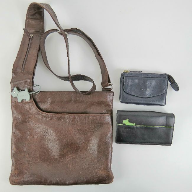 A brown leather Radley handbag, together with two Radley purses. Three items.