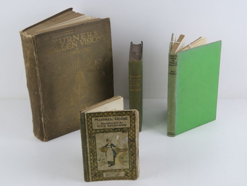 Books; Turners Golden Visions by C. Lewid Hind, published 1910, with illustrations. Together with Mother Goose illustrated by Kate Greenaway, engraved and printed London a/f, The Works of William Thackeray volume XXIII published 1879, and Whos Who in World Cricket by Roy Webber. Four items.