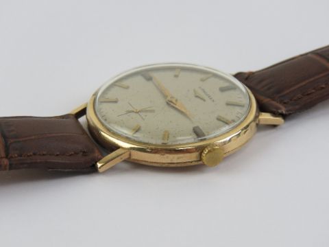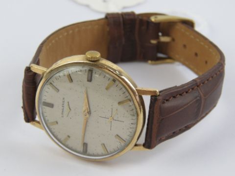 A 9ct gold Longines wristwatch having silvered dial with yellow metal hands, case hallmarked 375, on leather strap.