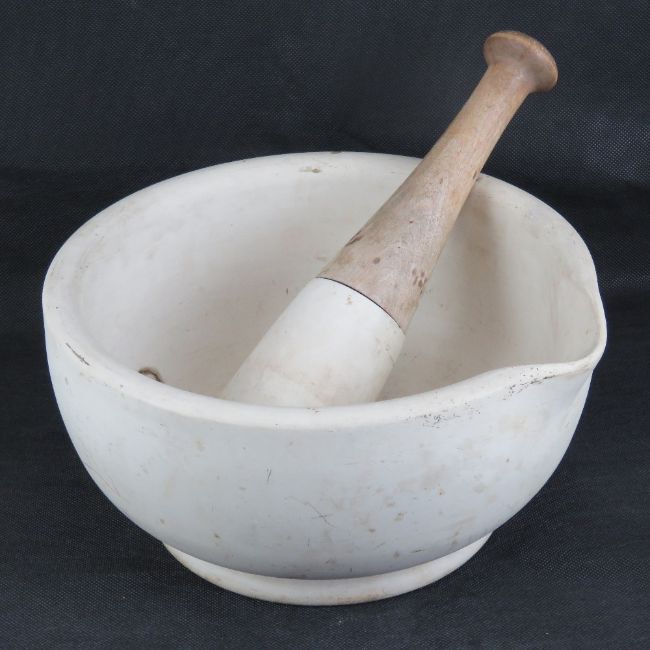 Apothecary advertising: a window display piece for a pharmacy /chemist shop in the form of an oversized ceramic mortar and pestle, the pestle marked 'wedgwood' with turned wooden handle, the mortar with pouring lip measuring 11 3/4" ( 29.8 cm) diameter and 6" ( 15.2 cm) high. Slightly a/f.