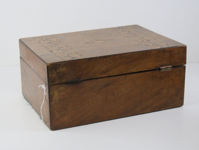 A Tumbridge ware walnut veneered work box, lid lifting to reveal pin cushion etc within, 29cm wide.
