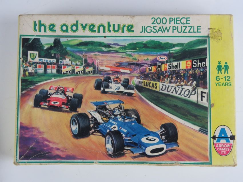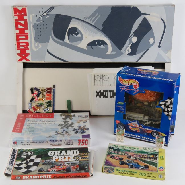 A Miniprix game in box, together with two car themed jigsaw puzzles, a Hot Wheels Easter egg and two packets of Ferrari Official TicTacs.