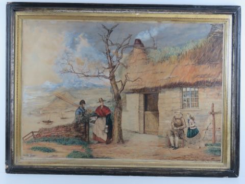 Watercolour Welsh School; fishermans thatched cottage, female in traditional Welsh costume, figures net mending, boats beyond etc, signed lower right EG Williams 1863, 49 x 71cm.
