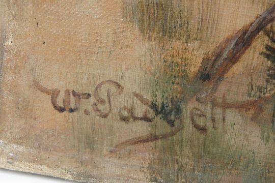 William Padgett (1851-1904), oil on canvas, The Fallen Roadside Shrine (sister picture to the one sold in 1998 by Bonhams entitled 'The Road Side Shine 1889' lot 193 for £700), signed lower left. 15 x 30" (38.1 x 76.2 cm). Footnote: Landscape painter; lived in London, Hampton and Twickenham. Exhib. At RA 1881-98, SS , GG, NG and elsewhere. Titles at R.A. ' Winter on the Marsh ', ' The Old Mill', ' In Flanders ' etc.' Wood, Christopher, The Dictionary of Victorian Artists 3rd ed., revised, Woodbridge, 1995. 'Padgett lived in London, Hampton and Twickenham. His works include Winter on the Marsh and The Old Mill. From 1881 to 1898 he exhibited in London at venues including the Royal Academy, Royal Institute of Oil Painters, Grosvenor Gallery, New Gallery, Ridley Art Club, Society of British Artists, a society which elected JW its President in 1886, and International Society of Sculptors, Painters and Gravers, a society that formed in 1898 with JW ( James Whistler ) as its President. He also exhibited at the Glasgow Institute of the Fine Arts, Walker Art Gallery in Liverpool and Manchester City Art Gallery. Padgett was among those included by William Christian Symons in initial dinner preparations for the Criterion dinner, held on 1 May 1889 to congratulate JW on being made an honorary member of the Royal Academy in Munich.' See. University of Glasgow , Correspondence of James McNiell Whistler