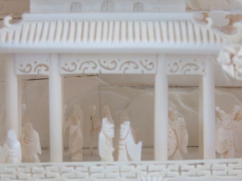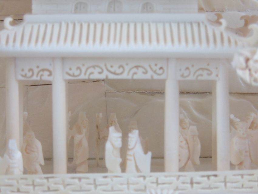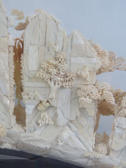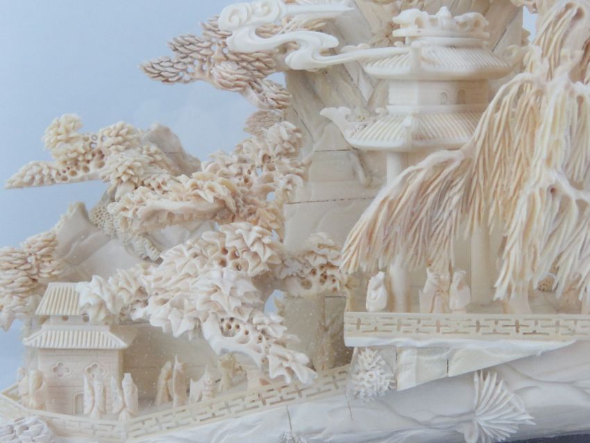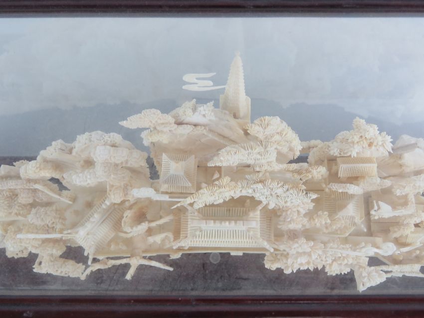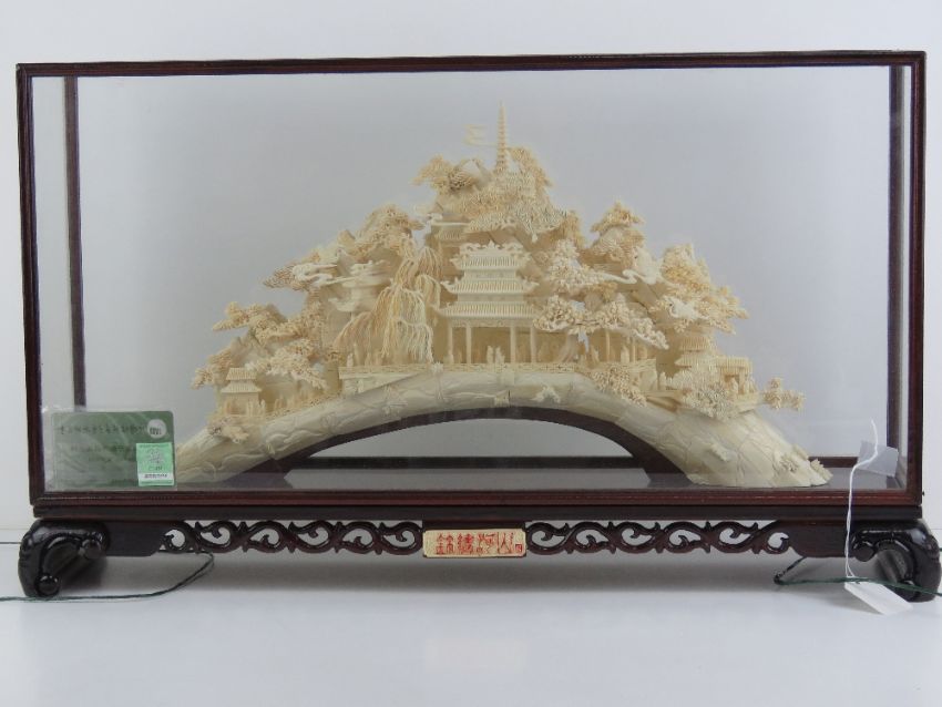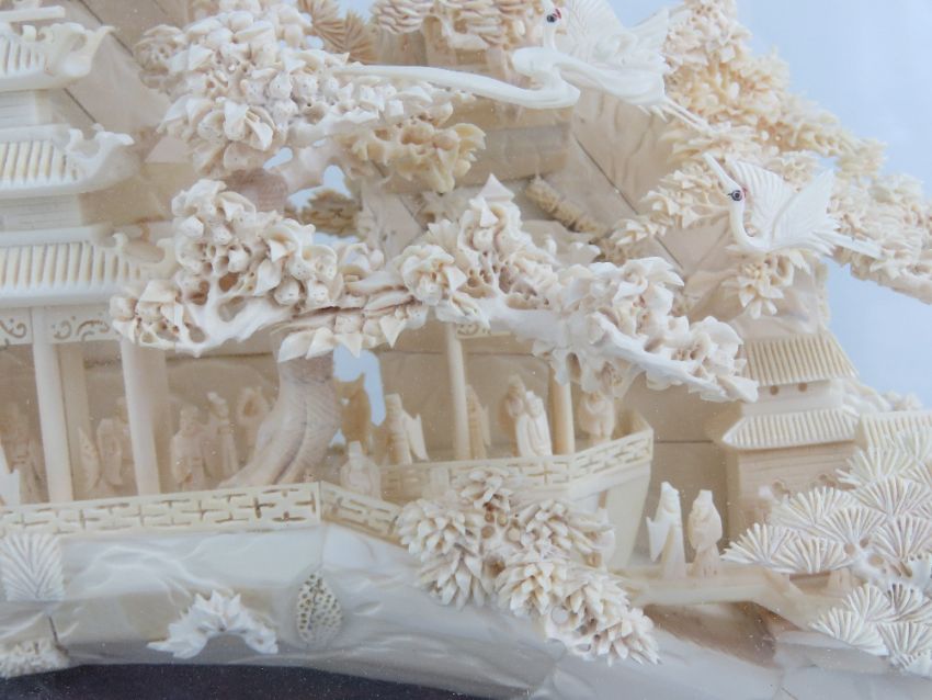 A highly decorative carved Woolly Mammoth tusk end (Extinct Genus Mammuthus Primigenius 10,000 - 20,000 years old), bearing additional buildings and foliage all carved in the Oriental style complete with flying storks, measuring, 49cm in length, contained within a glazed wooden display case, 64 x 37cm. With China Association of Mammoth Ivory certification card.