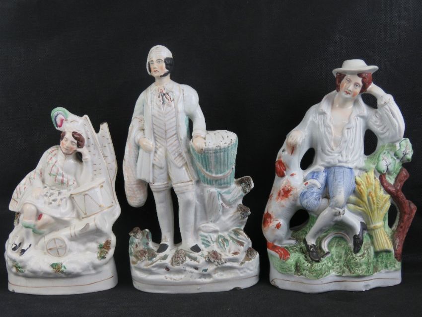 Staffordshire flatbacks; three assorted figurines ranging in size 26 - 35cm, a/f.