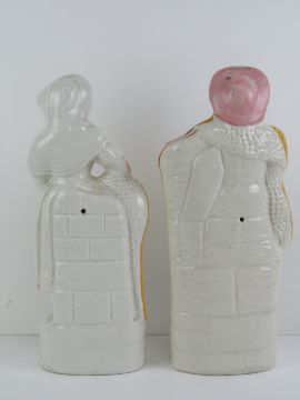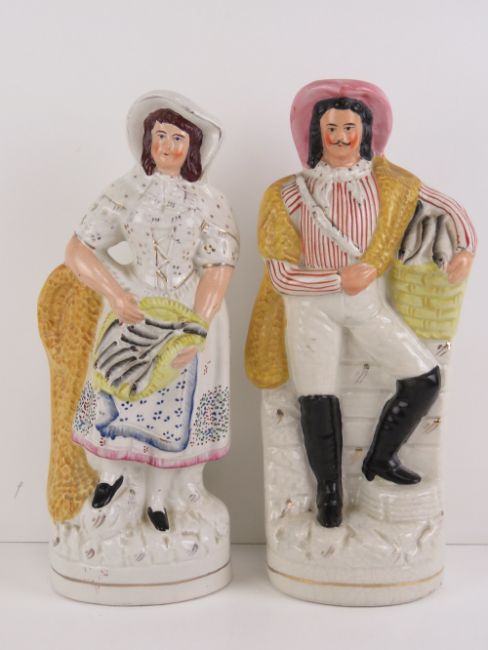 A pair of 19th century Staffordshire flatback figurines being man and woman each holding a woven basket of fish, each standing 36cm high.