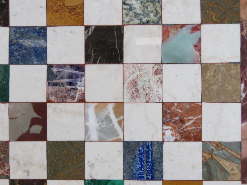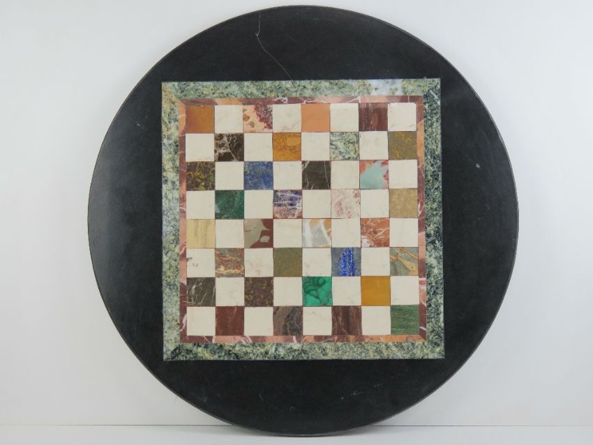 A circular inlaid specimen Pietra Dura tabletop, chequerboard style, 66cm dia.