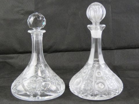 Two heavy cut glass 'ships' flat bottomed decanters, each with stopper.