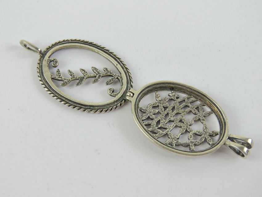 A HM silver 'open locket' having pierced floral panels to front and back, opening at bale, 4.7cm in length.