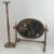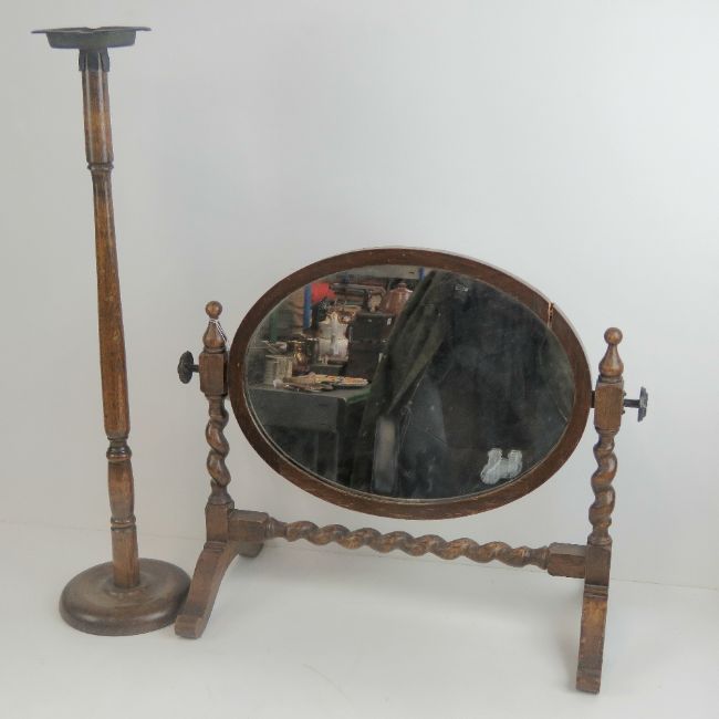 A c1930s stained oak smokers receptacle on stand, together with an oval toilet mirror on stand. Two items.