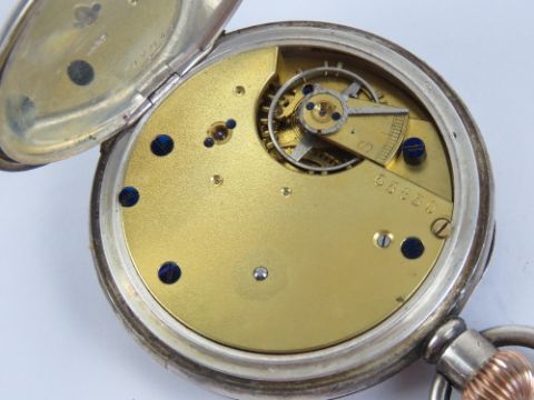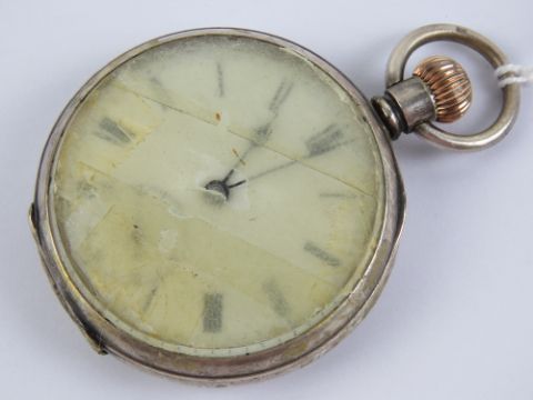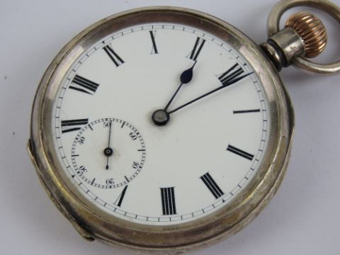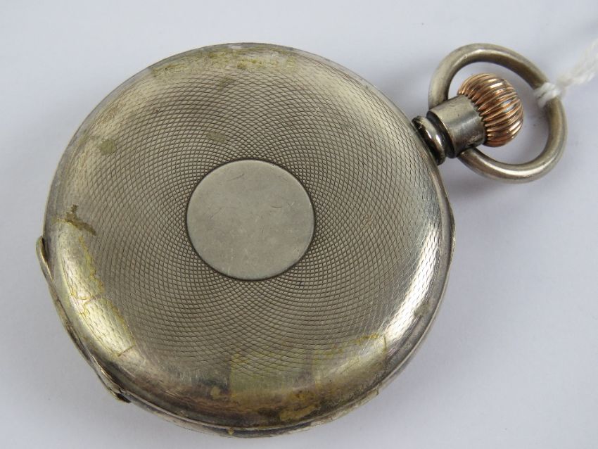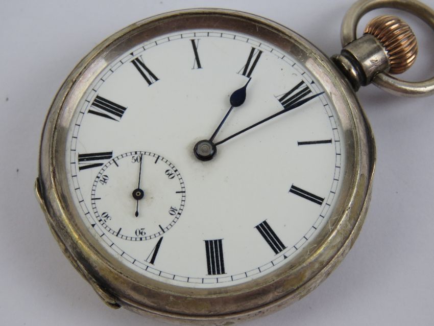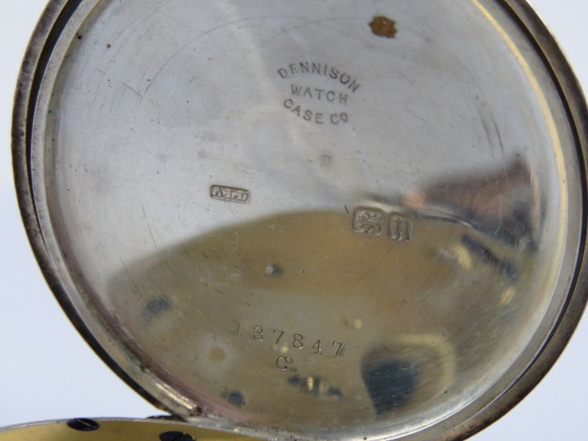 A HM silver top wind pocket watch having white enamel dial with blued steel hands and subsidiary seconds dial, silver Dennison case hallmarked Birmingham 1912, 44mm bezel, glass loose a/f, total weight 106.6g.