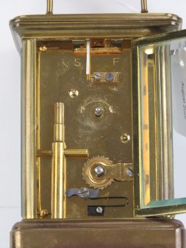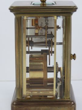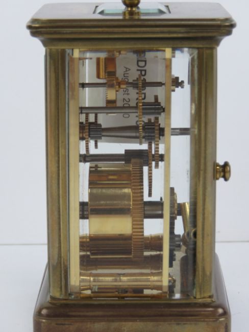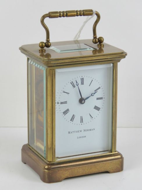 A Matthew Norman five glass brass carriage clock having swing handle over, with key.