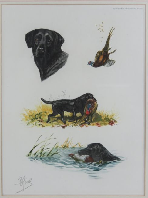 After Boris Stfanovitch Riabouchinsky (1898-1975) French, coloured sporting etching, marked to top 'Ch.Ducher et Cie . 35 Ave de l' Opera , Paris No 737', black Labrador studies. Posthumously signed in pencil lower left 'B Riab'. 13 1/4 x 10" (30.6 x 25.4cm). In a figured walnut and ebonised frame.