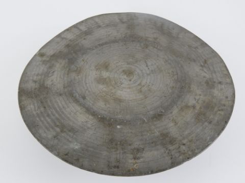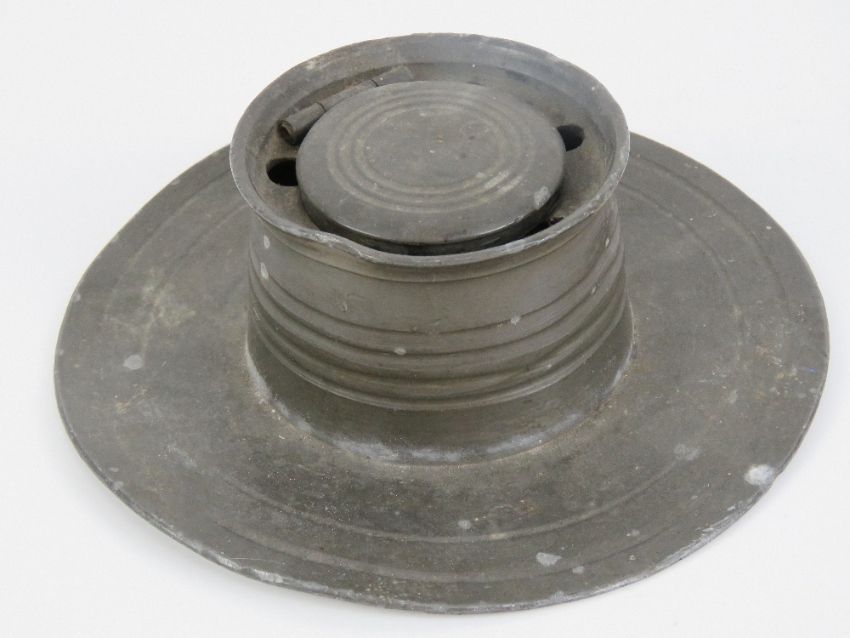 An Arts and crafts pewter inkwell of capstan form, with hinged lid and five quill / pen rest holes, 6” (15.2 cm) diameter.