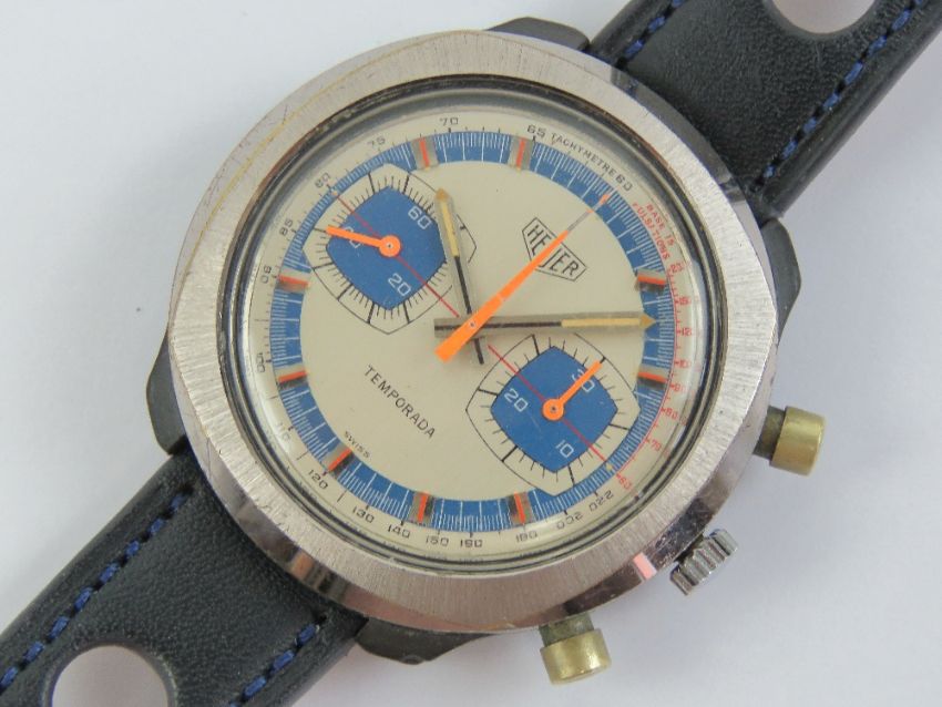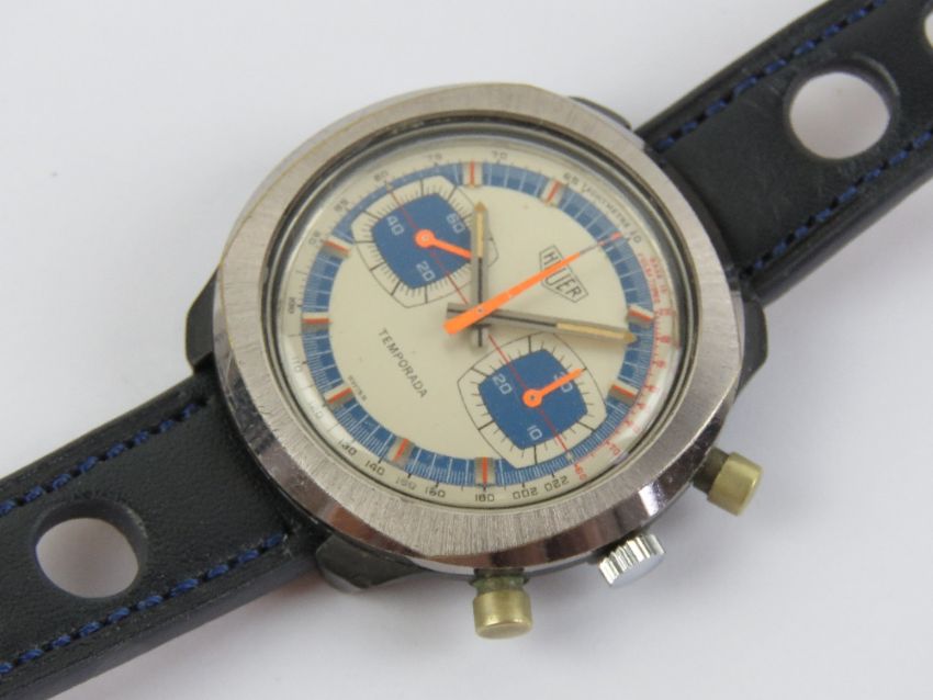 A 1974 Heuer Temporada wristwatch Ref 733809, stainless steel and plastic case, silvered dial with two subsidiary dials, on leather strap.