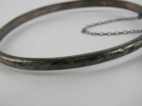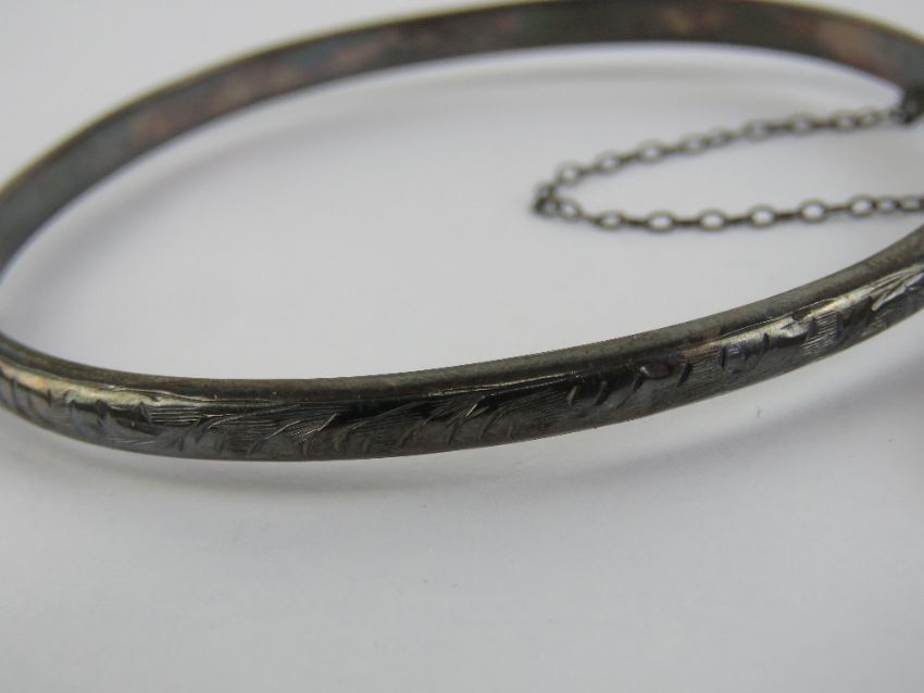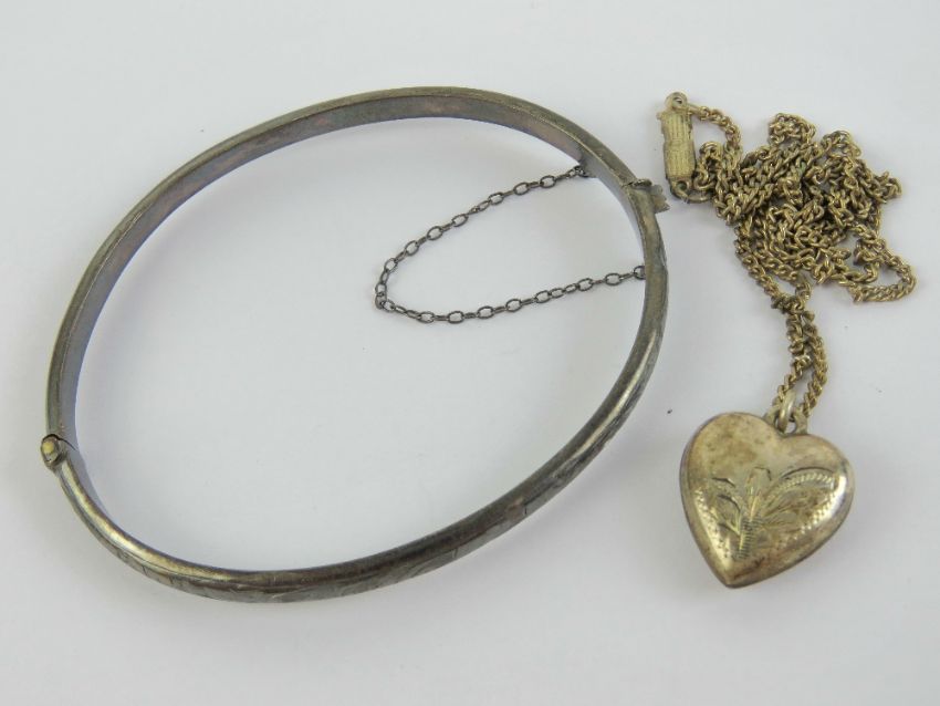 A silver heart shaped pendant on fine white metal chain, together with a sterling silver bangle having floral engraving to front, 6.3 x 5.1cm internal dia. Two items.