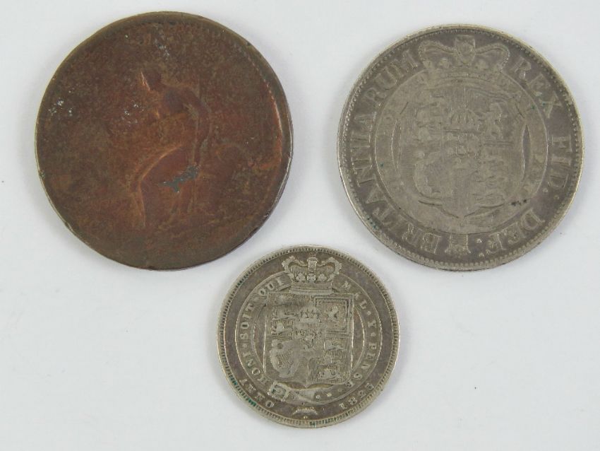 A George III 1817 half crown in F-VF condition, 13.8g. Together with a George IV 1825 shilling, 5.6g, together with another early 19th century coin in worn condition. Three items.
