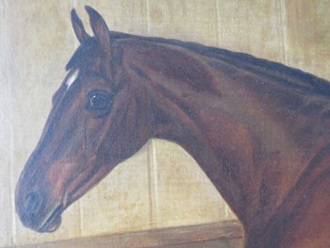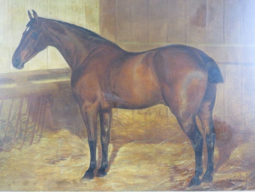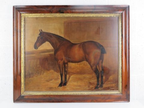 Walter Harrowing (c.1838-1913) Equine School, oil on canvas, a fine portrait of a Bay horse within a stable, signed and dated '1887', 23 x 28" (58.4 x 71.1 cm). In a moulded rosewood frame with gilt slip.