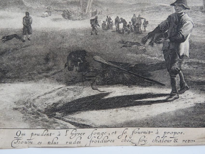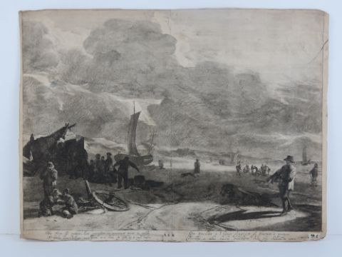 Pieter Nolpe (C.1613-c.1652 ) after Paulus Potter (1625-1654), monochrome etching, 'AER' circa 1650, a scene on a sea shore with fishing boats beached and a group gathered around a beach hut with barrels of fish. With parallel couplets of verse in Dutch and French. Printed under ' P Potter inventor / Pieter Nolpe Fecit / F de Wit excudit' numbered 24. 15 7/8 x 20 15/16" (40.3 x 53.2cm). For similar see The British Museum.