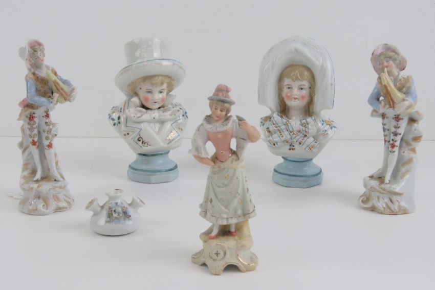 A quantity of Victorian farings together with a Liverpool crested miniature triform spill vase. Six items.