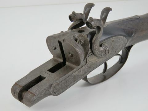 An obsolete calibre antique double barrelled shotgun stock and action (missing barrel), action having floral engraving upon and marked Jackson. Cocks and triggers.