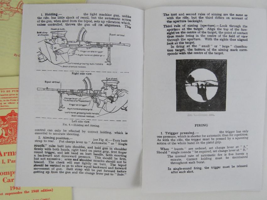 Five small arms training books; .38" pistol 1941, Sten machine gun 1942, Thompson 1942, and Bren 1941 (x2).