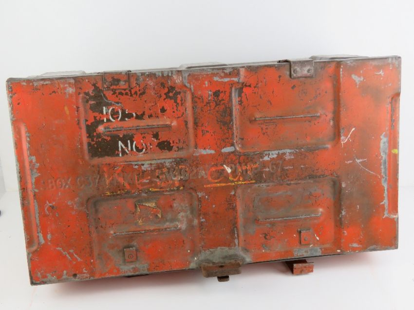 A large ammo box containing a quantity of netting. Tin marked 'C374 MkI SV462A PMT 67' and measuring 64 x 35 x 22cm.