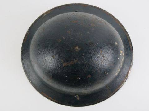 A WWII British Police helmet having liner and chin strap.